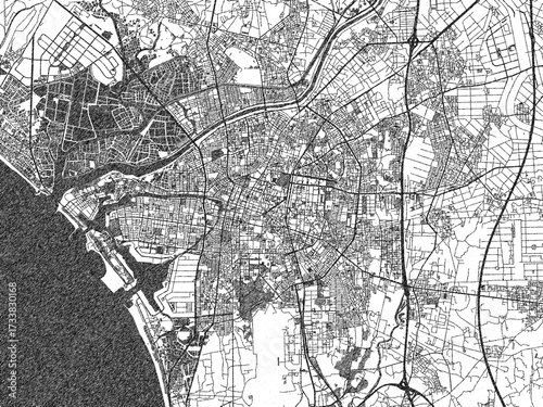 Naklejka premium Poster-ready black and white illustration map of Tainan, Taiwan, detailed and...