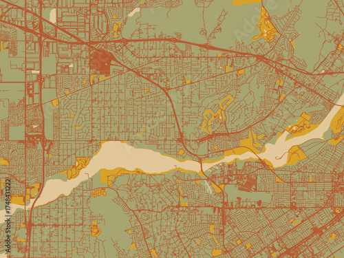 © W&S Stock, Obraz premium Poster-ready flat map of Jurupa Valley, California, earthy sage background with rust roadways and ochre details.
