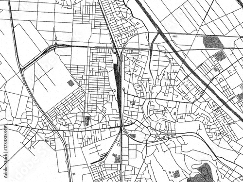 © W&S Stock, Naklejka premium Poster-ready monochrome city map of Niitsu-honcho, Japan, with detailed streets and rivers.