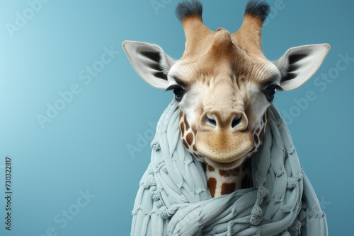 Naklejka premium Poster with image of a giraffe in a knitted scarf on a blue background