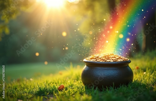© Vadym, Obraz premium Pot full of gold coins sits on green grass. Rainbow arches with sparkling light over cauldron. Sunlight shines on magical Irish treasure in meadow.