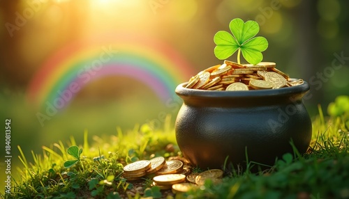 Fototapeta premium Pot of gold coins sits on green grass with a rainbow arching in soft sunlight. A lucky clover leaf sprouts from the overflowing treasure. St. Patricks Day theme.