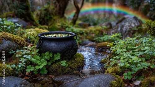 © Maksym, Obraz premium Pot of gold hidden among moss, surrounded by tiny shamrocks, magical soft light