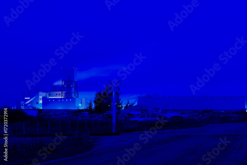 © kalafoto, Fototapeta premium Potash mining and processing facility in Saskatchewan at night with illuminated structures and smoke under a dark sky.