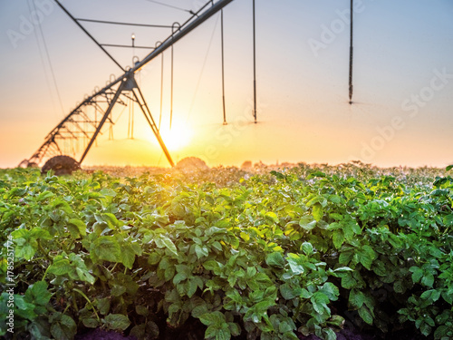 Naklejka premium Potato field irrigation system at sunset hydrating crops