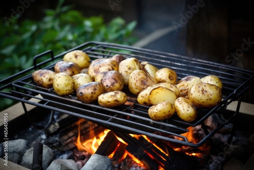 Naklejka premium potatoes on a makeshift grill over a campfire