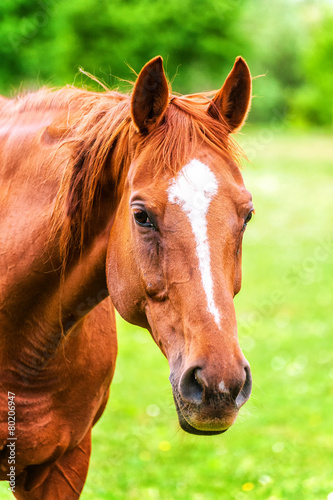 © marinv, Fototapeta premium Potężny piękny koń stojący w polu i patrząc strai