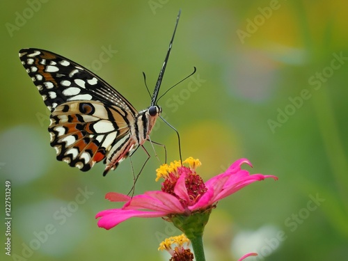 © Adi, Fototapeta premium Potrait Beautiful tropical lovely butterfly sitting bright yellow tropical flower on blur green background macro, 29 January 2025 Indonesia