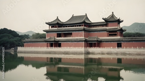 © Ryan, Fototapeta premium Potrait of massive palace standing in the side of the lake AI Generated Image