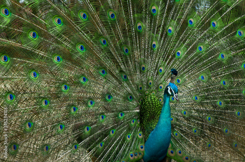 © Thanumporn, Naklejka premium Potrait of peacock with beak and beautiful tail.
