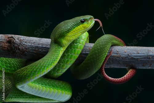 Obraz premium Potrait Trimeresurus erythrurus, commonly known as the red-tailed bamboo pit...