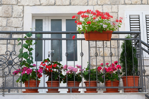 © Ga_Na, Naklejka premium Pots with bushes of blooming plants on balcony. Landscape design. Geranium and other decorative flowers. Bushes with red and purple flowers in pots.