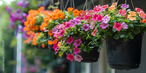 © Anastasiia, Fototapeta premium Potted Flowers Hanging on a Condo Balcony A Realistic Photo. Concept Floral Balcony, Urban Gardening, Lifestyle Photography, Condo Living, Outdoor Decor