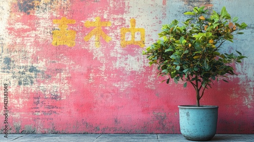 © Anisa, Fototapeta premium Potted plant stands against a weathered wall with golden characters