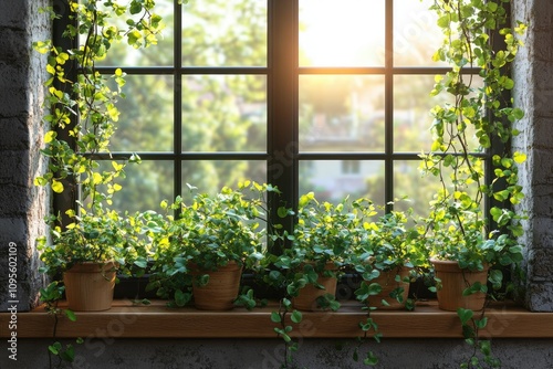 Fototapeta premium Potted plants on a windowsill, with greenery. Perfect for home decor, lifestyle, and nature-themed projects.