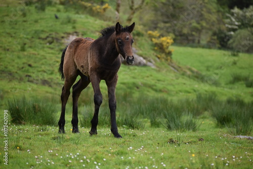 Fototapeta premium poulain dans une prairie verte sous temps grisâtre