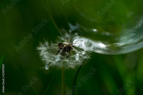 Fototapeta premium Pour and flies bakgraund with dandelion seeds and bubbles hitting it.