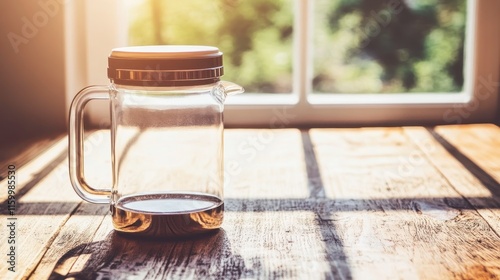 Obraz premium Pouring freshly brewed coffee kitchen table beverage photography morning light relaxed atmosphere
