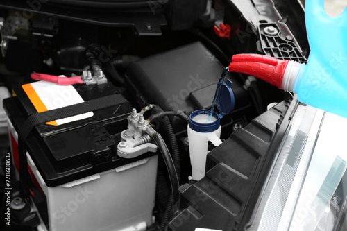 Fototapeta premium Pouring liquid from plastic canister into car washer fluid reservoir, closeup