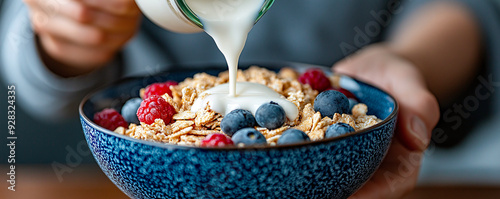 © Quality One , Fototapeta premium Pouring Milk on Cereal for Breakfast.