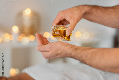 © Prostock-studio, Fototapeta premium Pouring oil into man masseur hand, closeup
