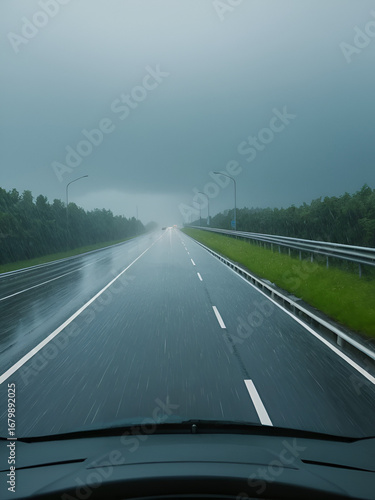 © Sean, Fototapeta premium POV: Carefully driving along an empty motorway during a severe summer rainstorm. First person view of a dangerous commute down an empty freeway during an intense storm. Driving during rainy season.