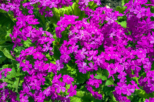 Naklejka premium Powdered primrose (Primula farinosa) is perennial herb from genus Primula. Bright magenta blooming flowers. For seed packaging cover. Natural background.