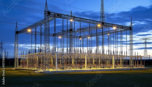 Fototapeta premium Power Distribution Center at Dusk A Web of Energy Infrastructure Against a...