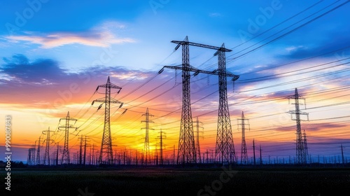 Fototapeta premium Power grid silhouetted at sunset, symbolizing the importance of protecting...