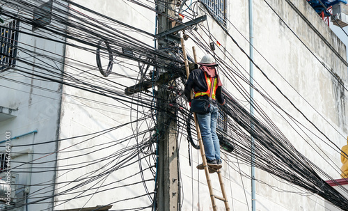 © surasak, Fototapeta premium Power line on electric power pole. electricians repairing. telephone line, intercom
