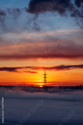 © oleg_ru, Obraz premium Power line support on the background of the sunset