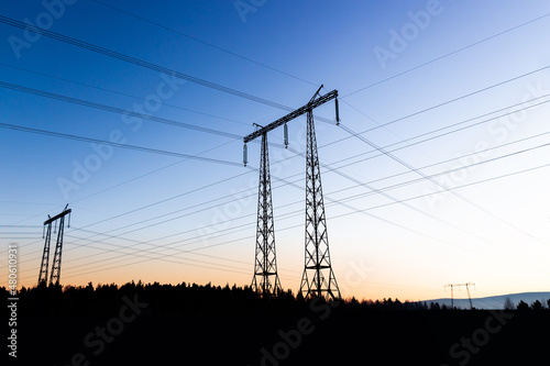 © Вера Тихонова, Fototapeta premium Power lines against the background of a evening sky above black silhouette forest. Air acrossing and perspective of electrical wires of power transmission lines. Corridor of power lines
