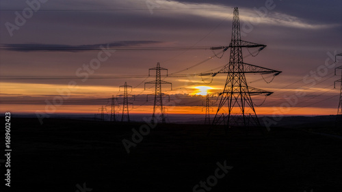 © jmh-photography, Fototapeta premium Power Lines on Countryside Landscape During a Vibrant Sunrise