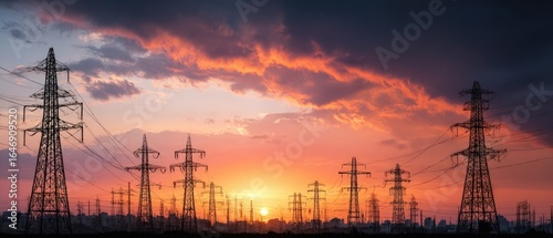 © Sepatu, Fototapeta premium Power lines stretching across a vibrant sunset