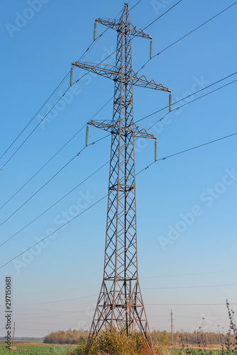 Fototapeta premium Power lines with various poles and supports, the appearance of an electrical...