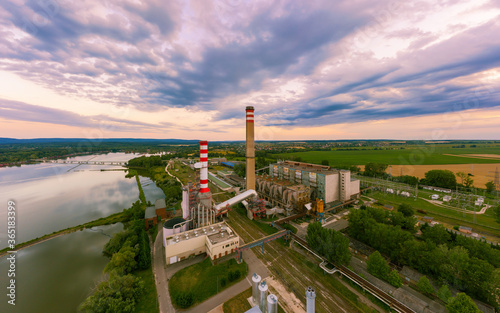 © Geza Kurka, Obraz premium Power plant of Oroszlany city in Vertes hills Hungary next to Lake bokod where are the famous village floating on water. This is a fishing paradise.