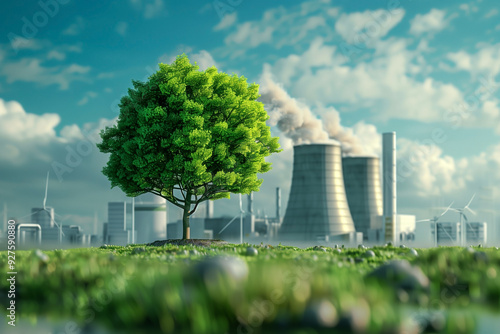 © -=RRZMRR=-, Obraz premium power plant with tree, green industry eco power for sustainable