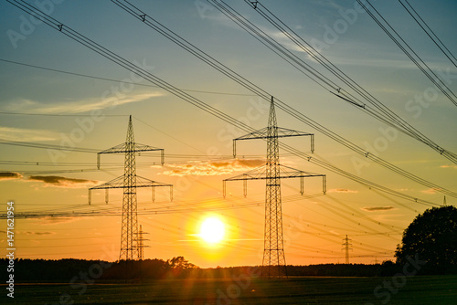 © Carsten Böttinger, Fototapeta premium Power poles in spring, sunset, in the field and on the meadow, Brandenburg, Germany