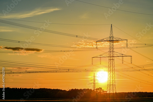 © Carsten Böttinger, Fototapeta premium Power poles in spring, sunset, in the field and on the meadow, Brandenburg, Germany