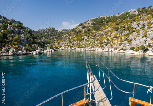 © stas_malyarevsky, Naklejka premium Powerboat. View from the boat. Mediterranean sea overlooking the mountains. Aerial top view of sea waves hitting rocks on the beach with turquoise sea water.