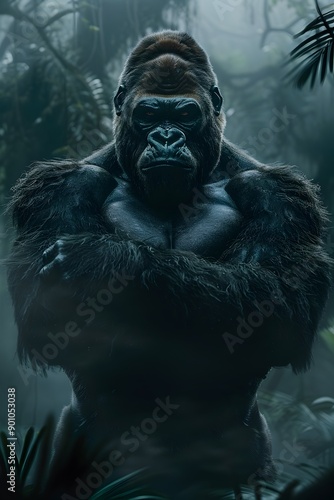 © vanilnilnilla, Naklejka premium Powerful and Brooding Gorilla Persona Towering Over Moody Jungle Landscape