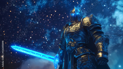 Fototapeta premium Powerful armored knight with glowing blue sword stands against a starry night...