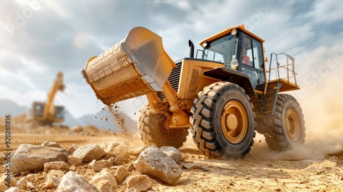 © SuriyaPhoto, Fototapeta premium Powerful Backhoe Lifting Heavy Rocks at a Construction Site with Cloudy Sky Background