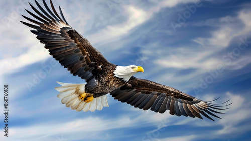 Obraz premium Powerful Bald Eagle in Flight with Blue Sky Background