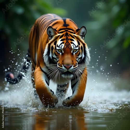 © shahidhasan100, Naklejka premium Powerful bengal tiger stalking through shallow water with splashing water droplets