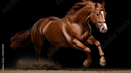 Fototapeta premium Powerful brown horse in full gallop on black background, kicking up dust.