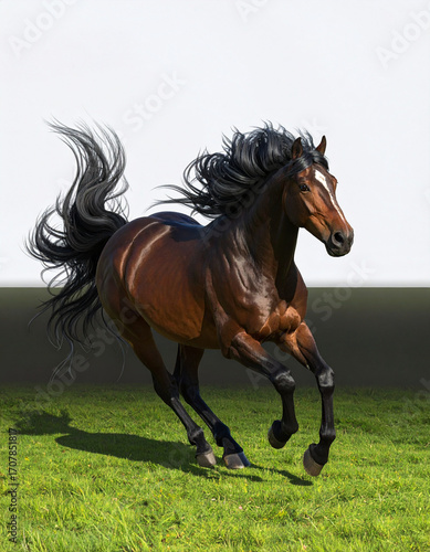 Obraz premium Powerful brown horse running across green grass with mane flying in motion