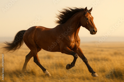 © Sashenkina, Fototapeta premium Powerful Brown Stallion Running Across Golden Field at Sunrise