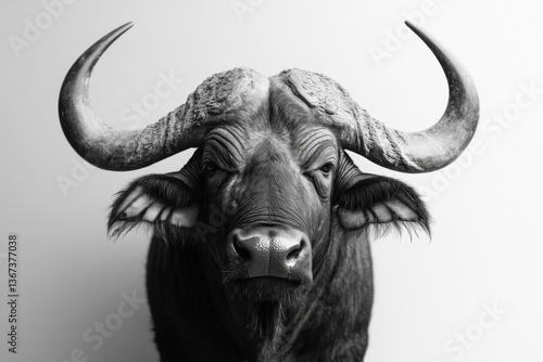 © dony, Fototapeta premium Powerful Buffalo Portrait in Black and White with Majestic Horns
