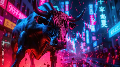 © jerseykamu, Fototapeta premium Powerful Bull Statue in Neon Lit Cyberpunk Cityscape at Night.